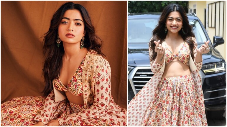 Rashmika, the Pushpa star, put forth her best fashion foot forward and turned up wearing a printed lehenga set. The diva opted for a contemporary ensemble, comprising a sultry bralette and a long cape-style jacket, for the trailer launch event. The floral-print outfit was a perfect pick to make heads turn without compromising on the comfort quotient. Now that the festival and wedding season is at the doorstep, you must consider seeking some inspiration from Rashmika’s new pictures from the Goodbye trailer launch. You can, in fact, add the same outfit to your wardrobe. Read on for the details.